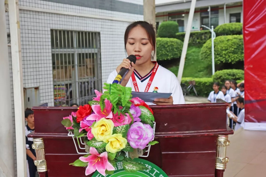 廣東省高新技術高級技工學校新團員入團宣誓儀式暨優秀團組織表彰大會于2019年5月27日16:10在西區足球場隆重舉行。參加本次大會的領導有:文建友副校長、學生處曾成處長、學生處陳偉副處長、團委書記劉榮榮、汽車工程系鄭大國主任、藝術與計算機系王慶有副主任、經貿系姚幸連副主任。參加大會的還有在校1833名團員。