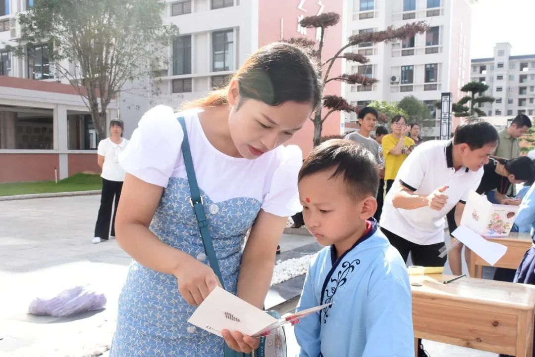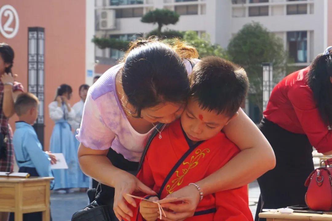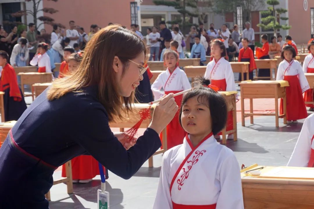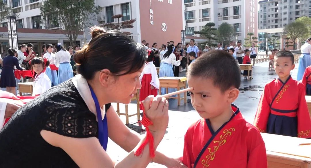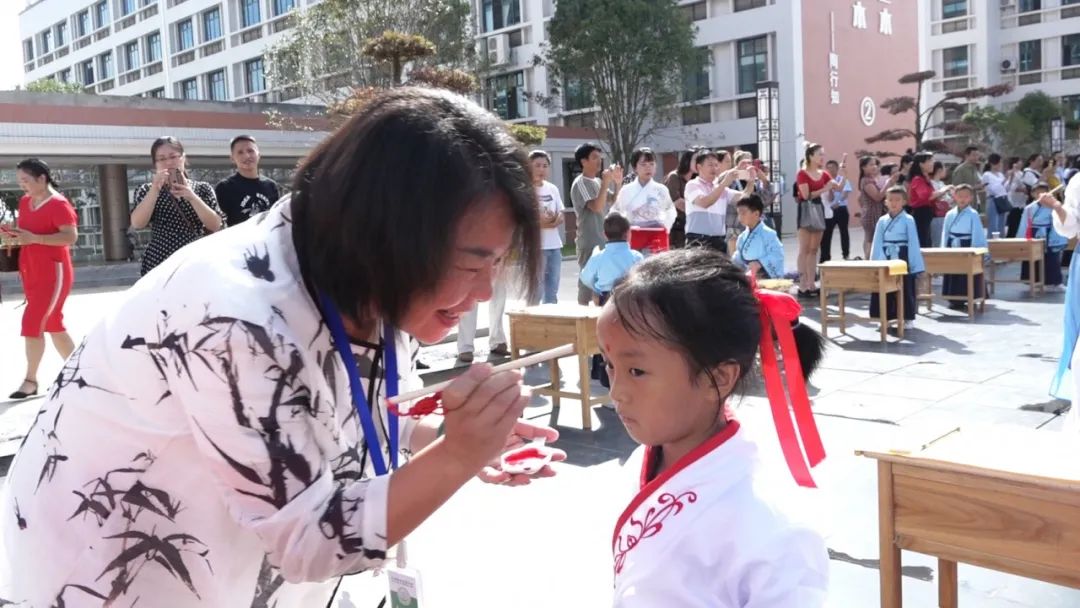 學校領導和老師們俯下身子,笑意盈盈地逐個為孩子們點朱砂,一張張稚氣的臉上多了一分靈氣和自信。